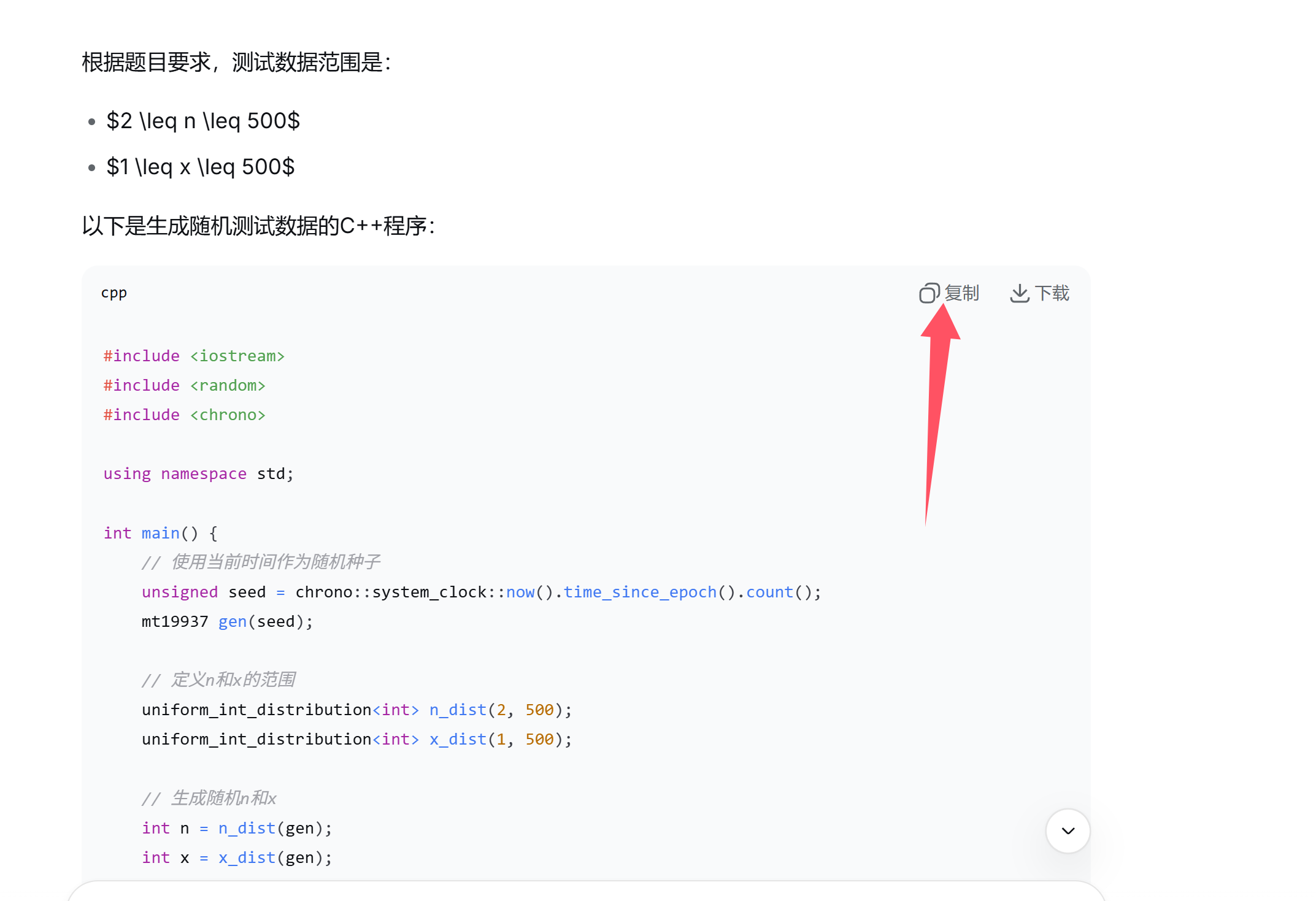 复制生成的随机测试数据生成程序,如果题目数据是树或者图,可以采用深度思考模式生成这个数据生成程序。