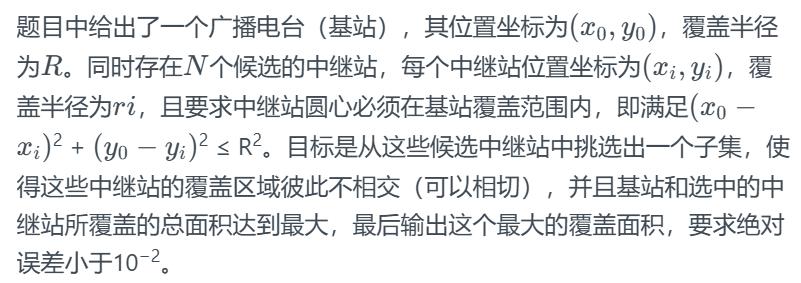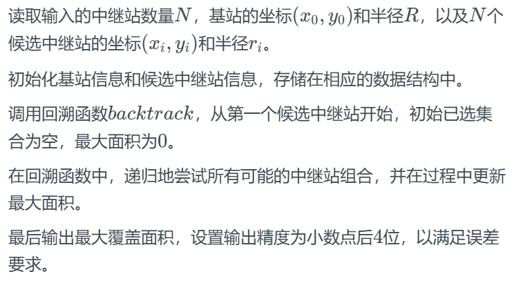 main函数:读取输入数据,初始化基站和候选中继站信息,调用回溯函数计算最大覆盖面积,并输出结果,设置输出精度为小数点后(4)位。
