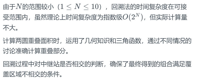 backtrack函数:回溯法的核心函数,递归地尝试所有可能的中继站组合。对于每个候选中继站,分别考虑选和不选的情况,选的时候检查是否与已选的中继站相交,若不相交则加入已选集合并继续递归,最后更新最大面积。