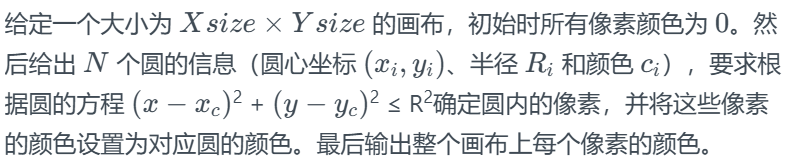 #include <cstdio> #include <cmath> const int MAX_SIZE = 1000; int canvas[MAX_SIZE][MAX_SIZE]; int main() { int Xsize, Ysize, N; scanf("%d %d %d", &Xsize, &Ysize, &N); // 初始化画布 for (int y = 0; y < Ysize; ++y) { for (int x = 0; x < Xsize; ++x) { canvas[y][x] = 0; } } // 处理每个圆 for (int i = 0; i < N; ++i) { int xi, yi, Ri, ci; scanf("%d %d %d %d", &xi, &yi, &Ri, &ci); // 计算可能在圆内的像素范围 int minX = (xi - Ri >= 0) ? xi - Ri : 0; int maxX = (xi + Ri < Xsize) ? xi + Ri : Xsize - 1; int minY = (yi - Ri >= 0) ? yi - Ri : 0; int maxY = (yi + Ri < Ysize) ? yi + Ri : Ysize - 1; for (int y = minY; y <= maxY; ++y) { for (int x = minX; x <= maxX; ++x) { if ((x - xi) * (x - xi) + (y - yi) * (y - yi) <= Ri * Ri) { canvas[y][x] = ci; } } } } // 输出画布 for (int y = 0; y < Ysize; ++y) { for (int x = 0; x < Xsize; ++x) { printf("%d", canvas[y][x]); } printf("\n"); } return 0; }